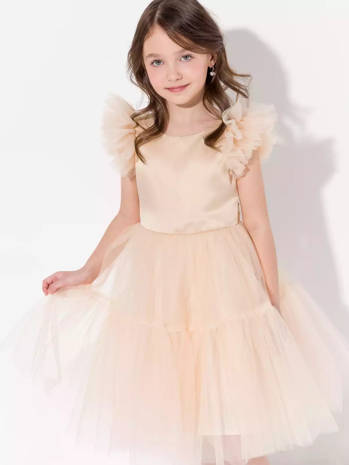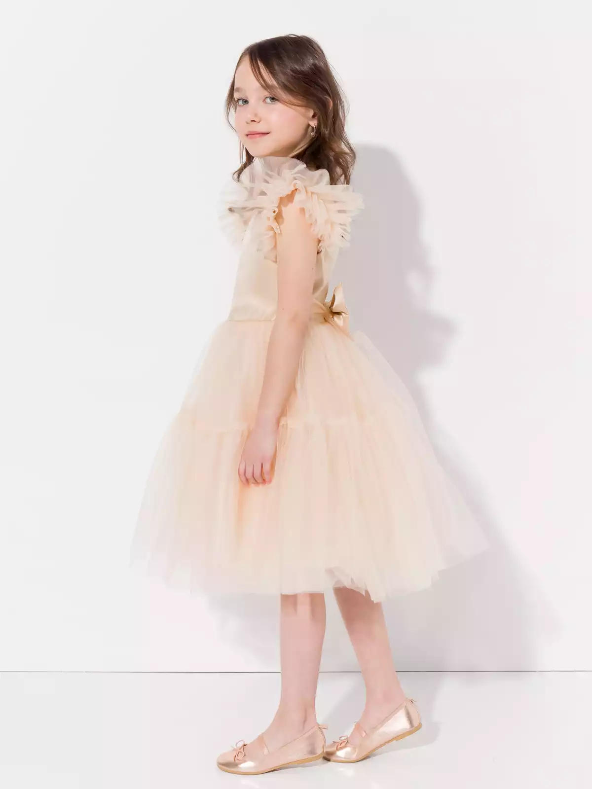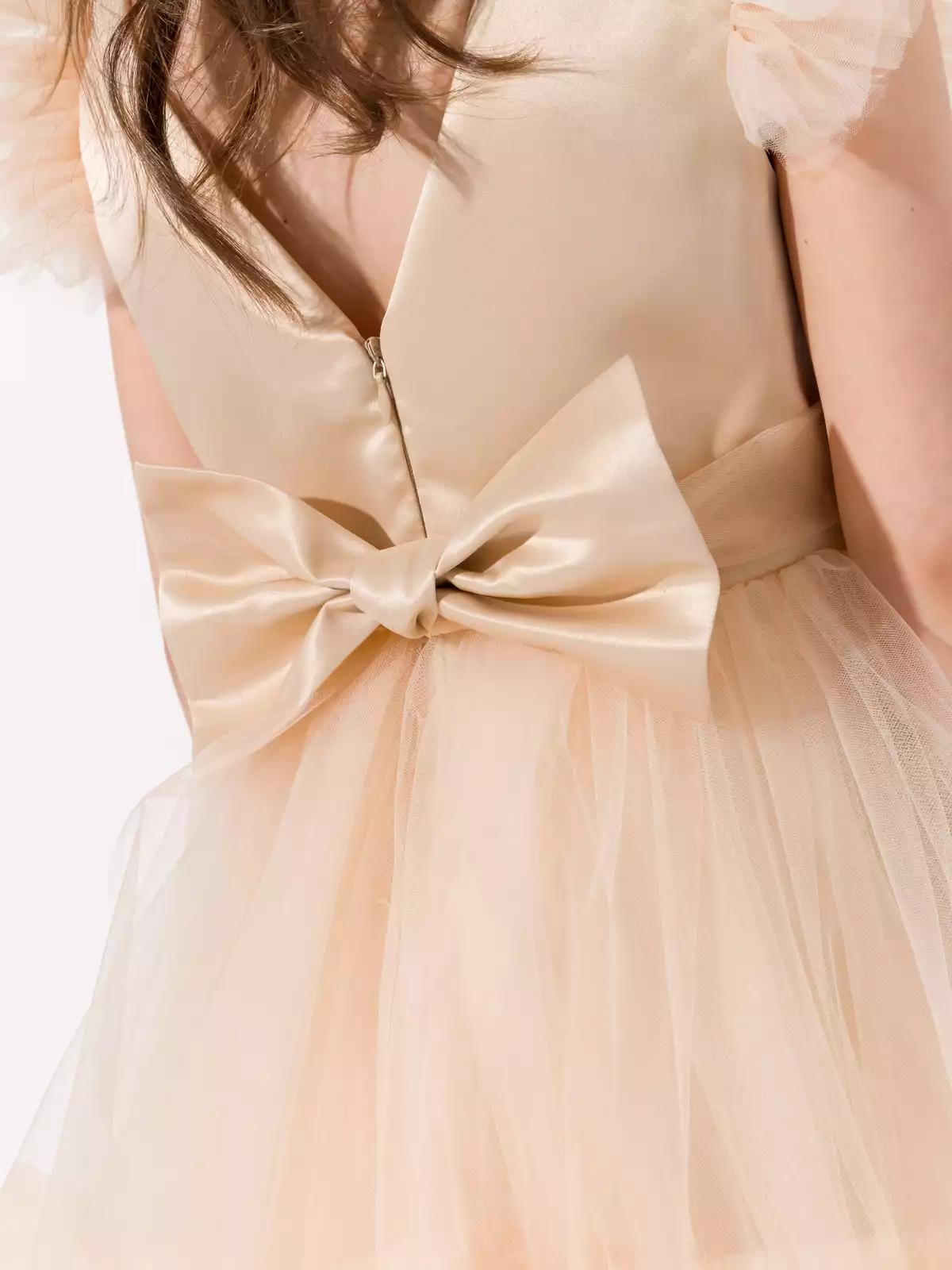 Невероятно пышное многослойное платье роскошно смотрится на фигуре юной леди. По спинке застежка на потайную молнию, что позволяет посадить платье на фигуру любой девочки, по спинке декорировано объёмным бантом. Хлопковый подклад по всей длине изделия для максимального комфорта. Все швы закрыты, платье приятно к коже. Высококлассные материалы: глянцевый атлас на лифе, 100% хлопок на подкладе и нежный шелковистый фатин. В таком роскошном платье ваша звездочка будет блестать на любом торжестве.