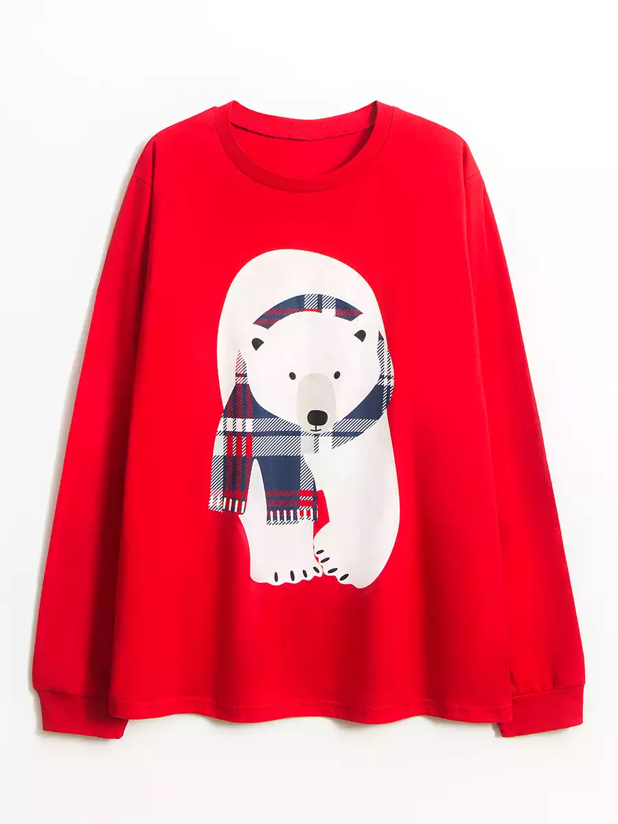 Пижама состоит из фуфайки с длинным рукавом и брюк. Брюки сшиты из материала с набивным рисунком. Фуфайка из однотонного материала и спереди украшена рисунком. Рукава фуфайки и низ штанишек на эластичной манжете под цвет фуфайки.